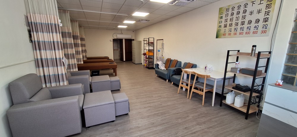 附帶設備: 冷氣x1,電熱水器x1,按摩床x4,腳底按摩椅x2,泡腳缸x2,櫃檯x1,接待桌椅X1,餐桌椅x1,置物櫃x1,監視設備x1,天花板,地板,門都是全新裝潢