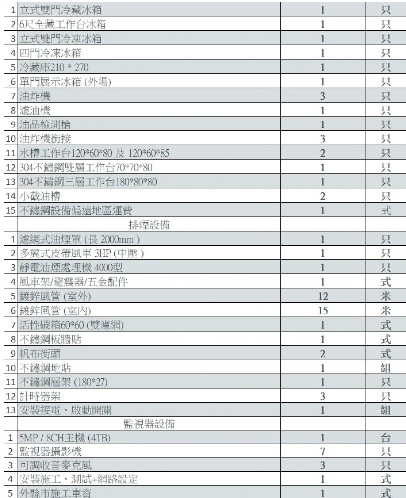 立式雙門冷藏冰箱 6尺全藏工作台冰箱 立式雙門冷凍冰箱 四門冷凍冰箱 組合式冷藏庫 單門玻璃冷藏冰箱 油炸機*3台 水槽工作台*2台 不鏽鋼工作台*2台 油脂截留槽 濾網式油煙罩 多翼式皮帶風車 靜電油煙處理機 監視器攝影機 不鏽鋼層架*數組