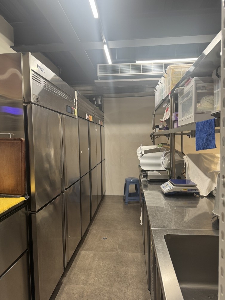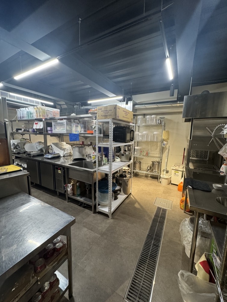 附帶設備: 不鏽鋼工作台、工作台冷藏冰箱、不鏽鋼單水槽、不鏽鋼雙水槽、不鏽鋼水槽下層板、不鏽鋼工作台上層板、不鏽鋼工作台下層板、雙層不鏽鋼層架、不鏽鋼平台工作桌、桌上型切肉機、雙口快炒爐、四門立式冷凍冰箱、四門立式冷藏冰箱、四門立式全凍冰箱、瓦斯四口西式爐、50人份瓦斯煮飯鍋、電子保溫鍋、嵌入式電磁爐、不鏽鋼調理台、不鏽鋼置物架、小型製冰機、洗碗機、不鏽鋼洗碗機工作台、不鏽鋼洗碗機平台、不鏽鋼收納架