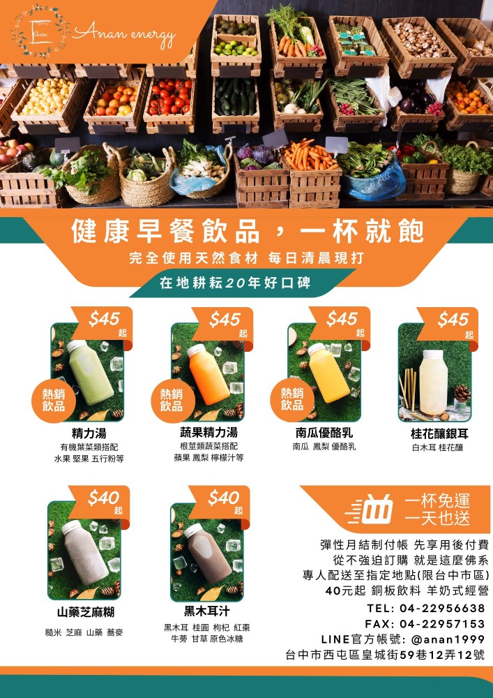 主打精力湯(綠拿鐵) 、蔬果精力湯、各式雜糧米漿、芝麻糊、銀耳湯等等